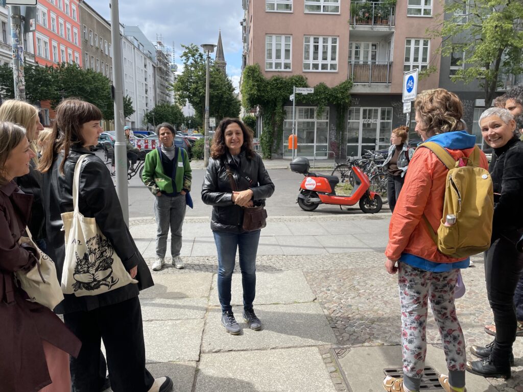 An Israeli speaker the next day who centred the irony of media and activist focus on hostages while paying no attention to Palestinian death – a paper that was deeply moving, but which also risked repeating the same displacement – was attacked by a journalist in the Q&A, and accused of anti-Semitic use of the term genocide. The speaker was firm in her commitment to a Free Palestine, but backtracked on the question of genocide, reframing it as a ‘genocidal war’. There were no other papers on affect and Palestine, and the encounter risked being instantiated as the central affective exchange of the conference’s response to the current genocide. Yet those of us on the scheduled walk through Berlin were encouraged to reflect on violence and affect, frequently invoking Palestine, and for me this was a generative and significant space. It allowed affect to course through our bodies in real time, and allowed connections to the complex histories of military and state violence we witnessed together to be tenuously threaded together. Perhaps this is where the potential abstraction of affect theory can be put to material use: in collectivity, in our bodies, in the artistic practice of the ambulatory hosts, and in our refusals to stay quiet in the face of an ongoing genocide.